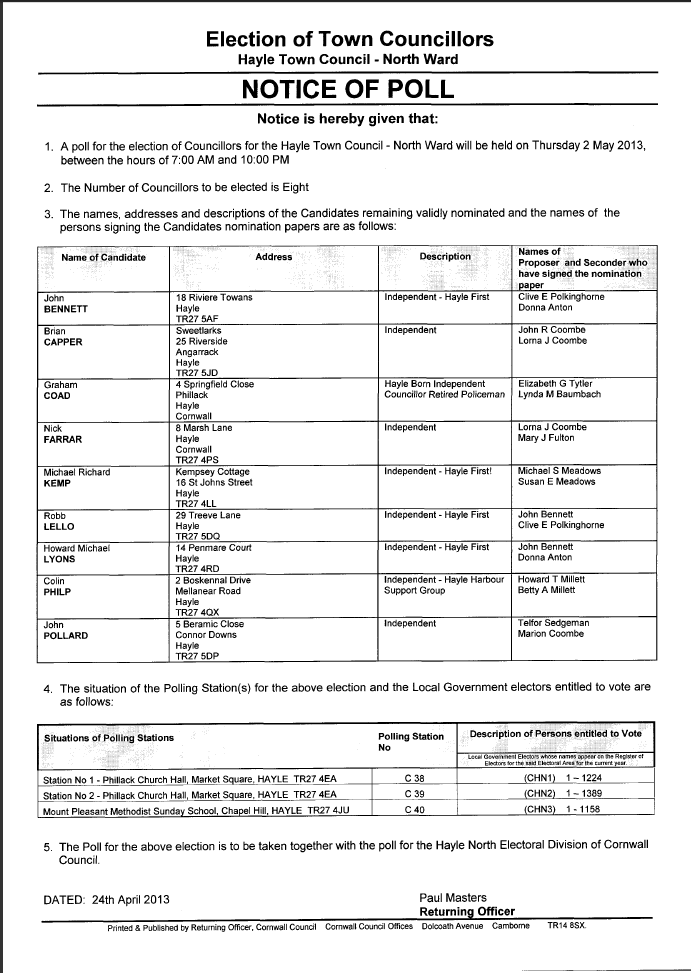 (You can inspect paper copies of the Notices of Poll and Notices of Election Agents at our offices in Liskeard and Camborne. The address for each office is on the right had side of this page.)