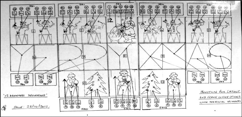 The “11 Pipers” had 22 active lighting elements but this one, “The Twelve Drummers” would have 51 (picture 2), so in hardware terms this would require a much larger control unit.- Printer-friendly version