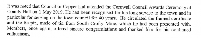 "It was noted that Councillor Capper had attended the Cornwall Council Awards Ceremony at County Hall on 1 May 2019. He had been recognised for his long service to the town and in particular for serving on the town council for 40 years. He circulated the framed certificate and the tie pin, made of tin from South Crofty Mine, which he had been presented with. Members, once again, offered sincere congratulations and thanked him for his continued enthusiasm."