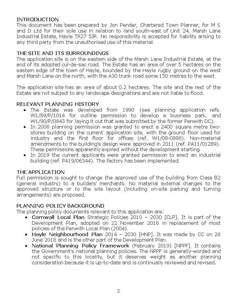 PA20/03108 | Proposed change of use from industrial building to builders merchant. Building is being constructed. | Land SE Of Unit 24 Marsh Lane Industrial Estate Hayle TR27 5JR