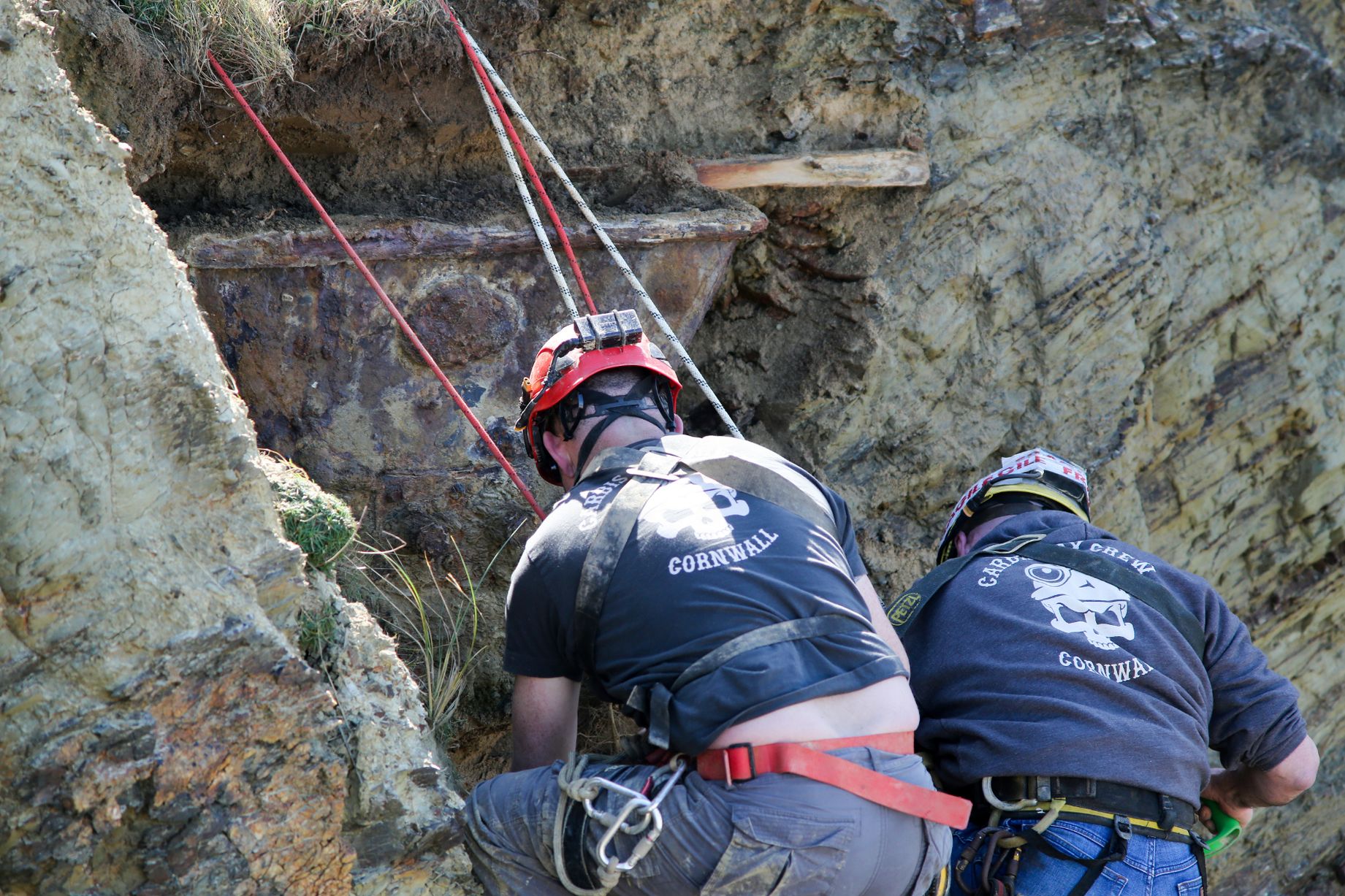 Dangling safely over the cliff-edge, members of the crew cleared away vegetation that was obscuring the cart, making it more visible for beach-goers to spot. Graham Wall and Sam Perkin from Carbis Bay Crew summarise the history of the cart, clearing up some of the recent speculation that it is a mine cart from the nearby Wheal Emily, a lead and copper mine which was abandoned in 1877.